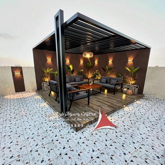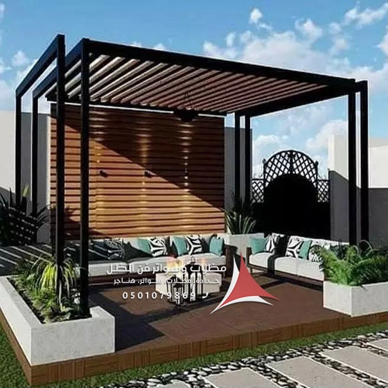نتميز بدمج الحديد مع سواتر خشبية أو أسقف متحركة، لتعطيك شكل مودرن يجمع بين دفء الخشب وقوة المعدن.